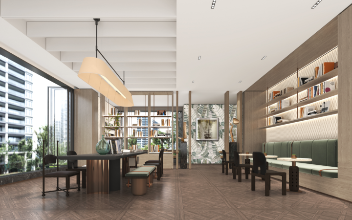 吧台卡座、阅读书桌、共享书架……这个空间里,业主有着就像自家客厅的安心,家长无论在旁陪伴还是聊点商务,都是上佳的选择。可以说,成人也有专属的社交角落,各得其所。