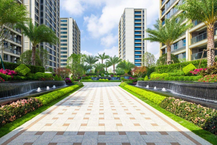 入内,棕榈树、罗汉松等气度非凡,组团花园错落有致,归家路上,步步有景,乐居在现场直观地感受到了园林景观的精心。